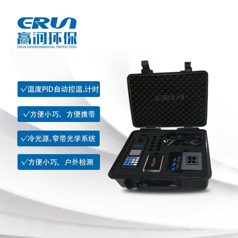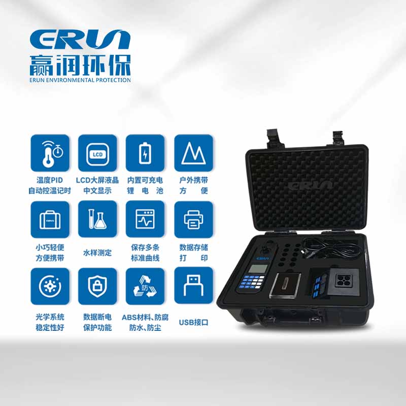 贏潤環保研發、生產的便攜式多參數COD、氨氮、總磷、總氮水質測定儀ERUN-SP-840A采用冷光源、窄帶干涉光學系統,光學性能穩定,具有PID自動控溫、計時等功能,操作簡便、省時,USB端口可連電腦讀取或快速打印數據。